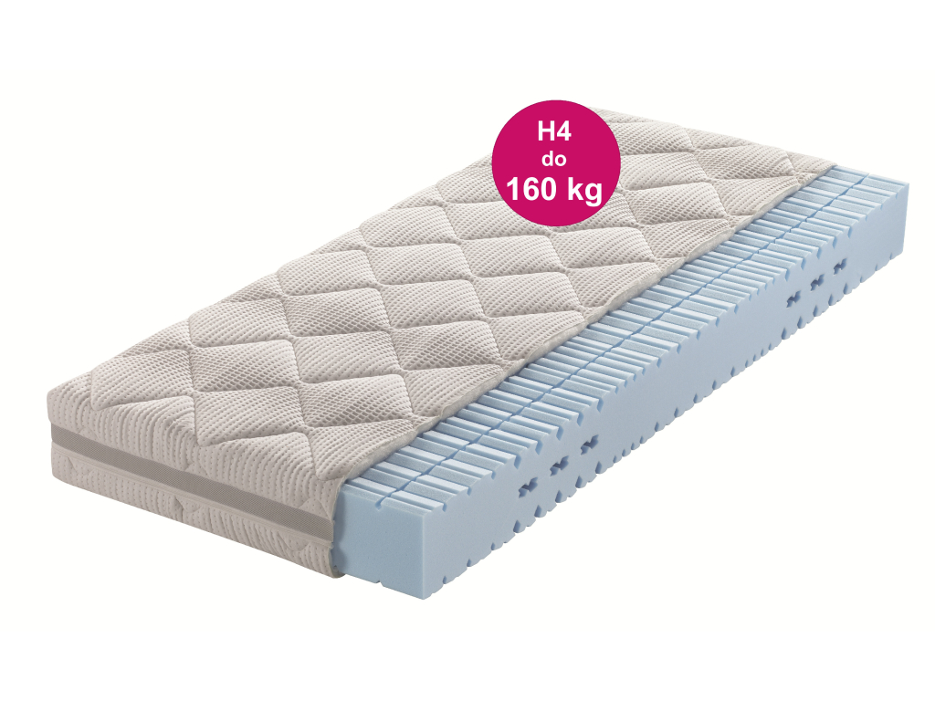 kombinuje opěrnou funkci s optimálním uvolněním od tlaku. - Matraci je možné mít také v tuhosti H4, která je určena pro vysokou zátěž až 160 kg. V této variantě je použita pěna o objemové hmotnosti 55 kg/m3